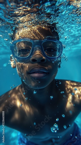 © Blackmint Studio, Fototapeta premium A young boy with swimming goggles explores underwater, surrounded by shimmering bubbles and light reflections from the surface. He enjoys the refreshing experience