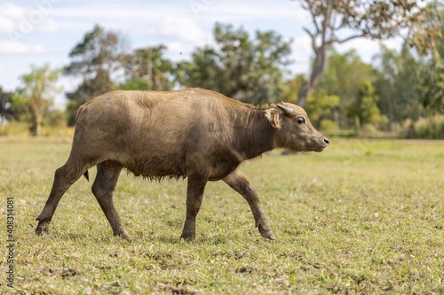 Fototapeta premium A Young Buffalo In The Field, Udon Thani, Thailand.