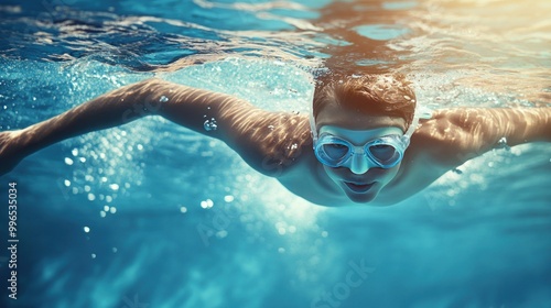 Naklejka premium A young Caucasian male swimmer dives into the water with goggles, showcasing...