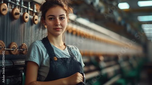 © Nathan, Fototapeta premium A young Caucasian woman in denim overalls stands confidently in a textile factory, surrounded by machinery.