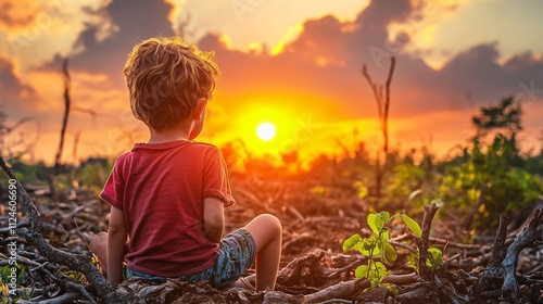 © Rama, Naklejka premium A young child among decaying trees in an empty land