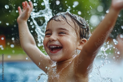 © Babb, Obraz premium A young child is splashing in a pool, smiling and laughing
