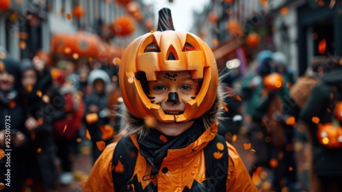 © Sangsung, Naklejka premium A young child is wearing a pumpkin costume and smiling for the camera