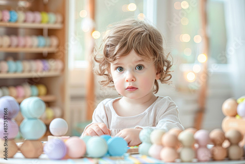 © Kowit, Fototapeta premium A young child playing with Montessori toys, focusing on their concentration and independence.