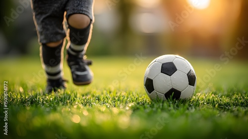 © warasiri, Fototapeta premium A young child wea socks and black shoes runs towards a soccer ball placed on the green grass, illuminated by the warm glow of the evening sun.