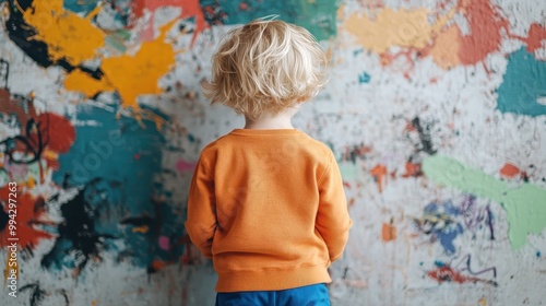 Obraz premium A young child with blond hair is facing away and admiring the colorful splashes of paint on a wall, emphasizing a mix of creativity, innocence, and artistic expression indoors.