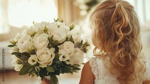 © JoxyAimages, Naklejka premium A young child with blonde curls is holding a lush bouquet of white roses, facing away towards soft lighting, capturing a moment of gentle elegance and purity.