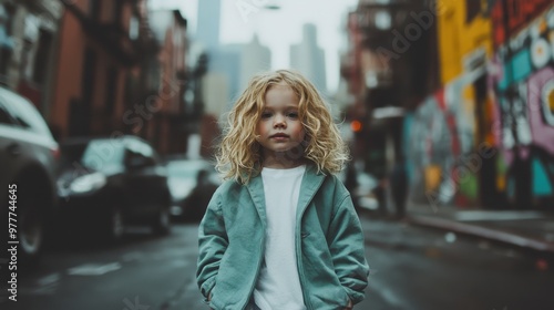 © Dulemegapixel, Fototapeta premium A young child with curly hair stands in the middle of an urban street, surrounded by graffiti-covered walls, showcasing a blend of innocence and urban life.