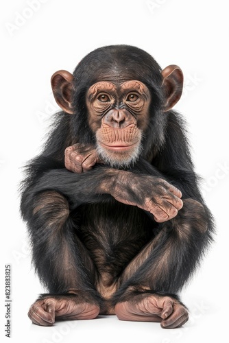 Fototapeta premium A young chimpanzee sitting on a white surface. Suitable for various educational materials