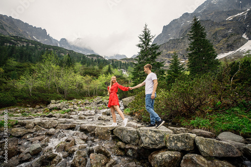 Naklejka premium a young couple, a girl in a red dress, and a man in a white T-shirt and blue pants, are walking in the Tatra National Park in Poland
