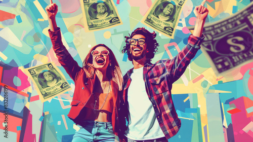 © NooPaew, Fototapeta premium A young couple celebrating a new property purchase, surrounded by real estate signs and cash flow diagrams, emphasizing appreciation and profitable investments.