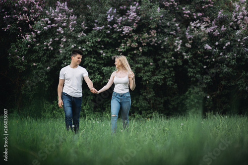 © dsheremeta, Fototapeta premium A young couple in love holding hands and walking forward in front of a flowering bush