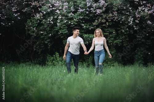 © dsheremeta, Fototapeta premium A young couple in love holding hands and walking forward in front of a flowering bush