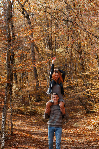 Naklejka premium A young couple in love in the autumn forest