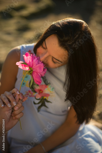 © viktoria_koks, Fototapeta premium A young couple in love, on the shore of the Bay at sunset