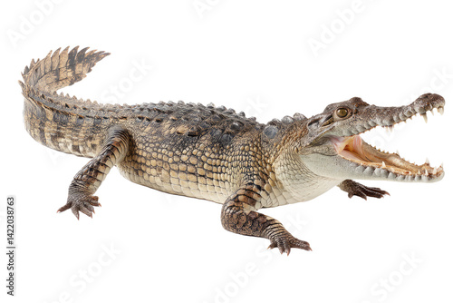 © Rowshen, Fototapeta premium A young crocodile showcasing its powerful jaws in a dramatic pose against a stark white background.