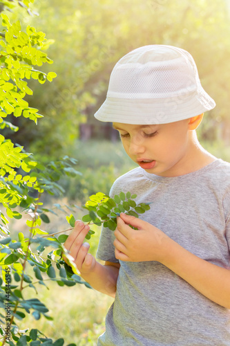 Obraz premium A young curious child in a hat explores the world for a walk in a summer park. A boy examines a plant, holds green leaves and a branch in his hand and looks carefully.