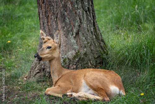 © Lema-lisa, Obraz premium a young deer lies near a tree on a summer day among the grass, selective focus