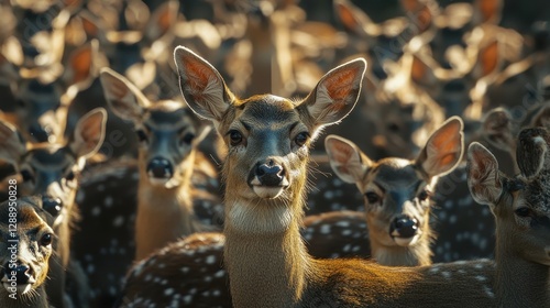 Fototapeta premium A young deer stands out amongst a herd of deer