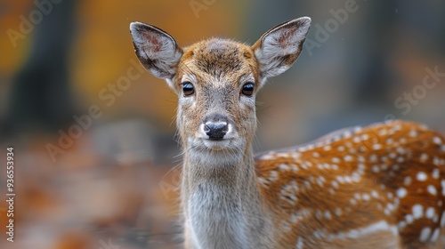 Fototapeta premium A young deer with distinctive spots stands alert in a forest with colorful...