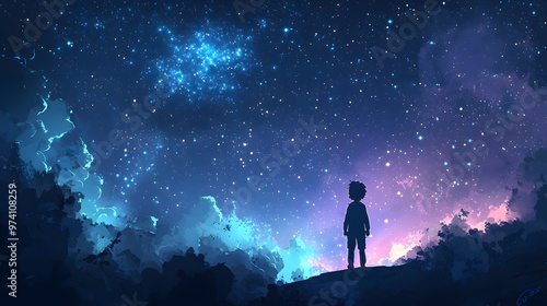 © Paisan, Fototapeta premium A Young Dreamer Gazes Upward at a Celestial Wonderland Full of Twinkling Stars and Cosmic Beauty. 2D Cartoon Concept