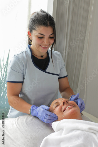 © atikinka2, Obraz premium A young esthetician in uniform performing a professional facial treatment on a mature female client in a clean spa environment.