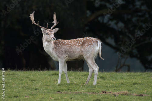 © alan1951, Fototapeta premium A young fallow deer stag standing on grass with a dark forest in the background sideways profile angle and looking slightly back.