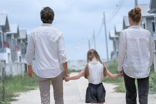 Obraz premium A young family walks hand in hand toward a new housing development. Seen from behind, the parents and their daughter symbolize a journey together towards a new home and a bright future.