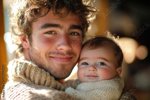 Obraz premium A young father lovingly embraces his infant child, a tender moment of paternal affection.