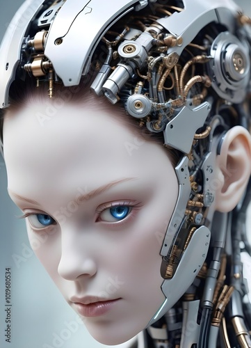 Fototapeta premium A young female cyborg , mechanical elements. appears to be a futuristic or science fiction character