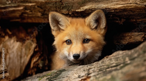 © mila103, Obraz premium A young fox looks out from behind a pile of logs in a forest. The animal appears curious and alert with bright eyes and a soft coat. Sunlight filters through the trees.