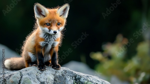 Obraz premium A young fox sits on a rock, displaying its vibrant orange fur and inquisitive...
