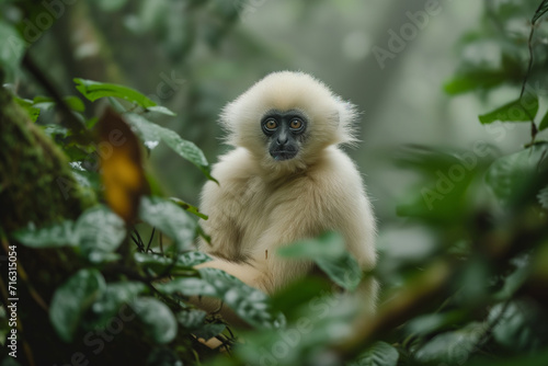 Fototapeta premium A young gibbon looks intently, surrounded by dense, misty foliage in a...