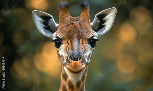 Fototapeta premium A young giraffe with large, curious eyes stares directly into the camera,...
