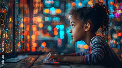 Obraz premium A young girl engrossed in a computer screen, surrounded by colorful, futuristic digital elements. Ideal for technology, education, and future-focused content.