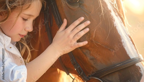 © Palid, Obraz premium A young girl gently caresses a brown horse's head, illuminated by warm sunlight, showcasing a tender connection between child and animal.