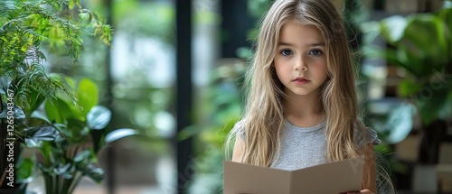 © Supriyati Pixxel, Naklejka premium A young girl holding a book, surrounded by lush indoor plants, conveying curiosity and innocence.