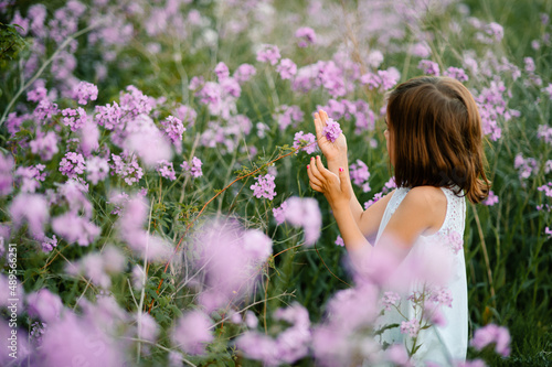 Fototapeta premium A young girl in a white dress inspects a flower in a field of purple flowers
