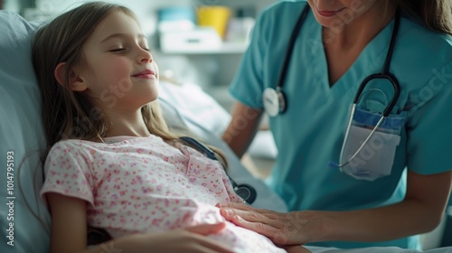 © Fotograf, Obraz premium A young girl rests in a hospital bed, surrounded by medical equipment