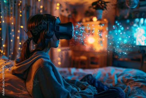 © Peeradontax, Obraz premium A young girl sits in a cozy room wearing a virtual reality headset, fully immersed in a digital world.