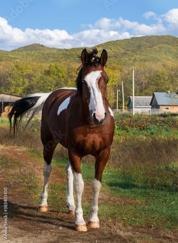© Денис Прохоров, Fototapeta premium A young girl sits on a horse and rides a black horse on a Sunny day.Photos of different horses.