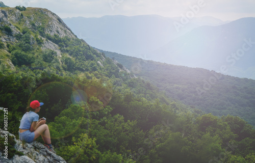 © fifg, Obraz premium A young girl sits on edge cliff and looking at mountain landscape