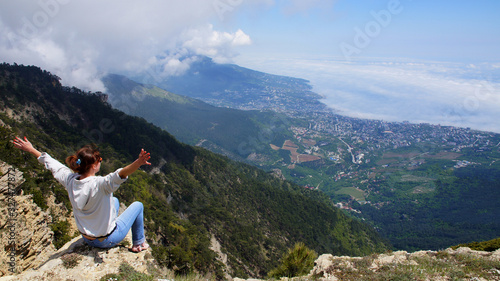 © Алекс Ренко, Naklejka premium A young girl sits on top of a mountain with arms outstretched.