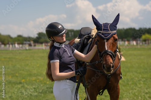 Fototapeta premium A young girl stands next to a horse before an equestrian competition.