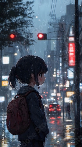 © QITIAN, Obraz premium A young girl waits under the rain at a city intersection, lost in thought.