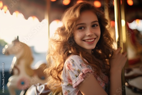 Obraz premium A young girl was excited and happy while on a carousel, merry-go-round, and...