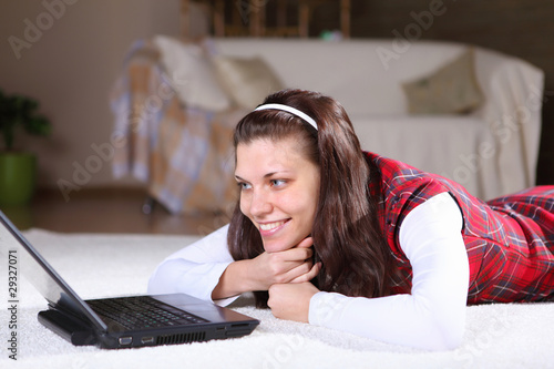 © Sergey Nivens, Fototapeta premium a young girl with a lap top at home