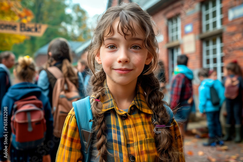 © foxyburrow, Fototapeta premium A young girl with braided hair and a plaid jacket smiles brightly at the camera, with other students and a "Welcome Back!" sign in the background at a school.