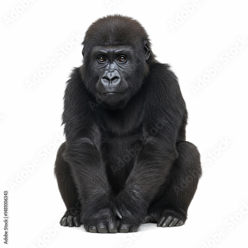 Fototapeta premium A young gorilla sitting with its arms resting on its knees, expressive eyes, thick dark fur, relaxed and thoughtful expression, white background