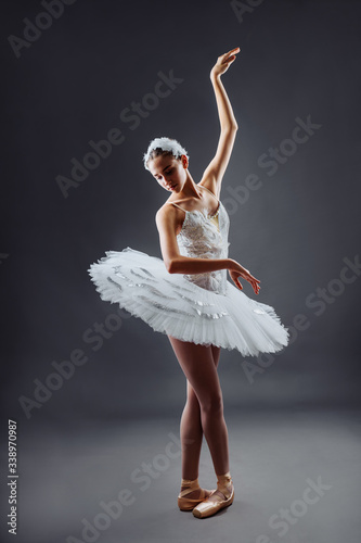 Naklejka premium A young graceful ballerina dressed in professional attire, pointe shoes and a white tutu, demonstrates dance skills. Beautiful classic ballet dancer isolated on grey backgroung in photostudio